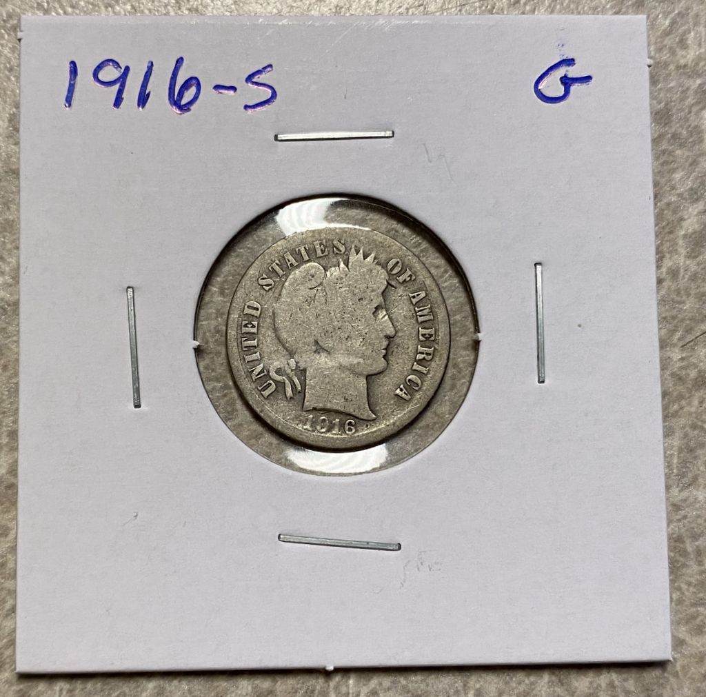 1916-S Barber Dime, good condition, paper case. 1916-S Barber Dime, good condition, paper case.