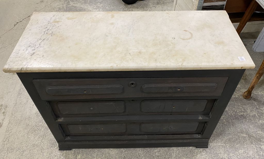 Painted Antique Marble Top Chest, needs pulls, white marble, three drawers, 29"h., 39"w, 16"d Painted Antique Marble Top Chest, needs pulls, white marble, three drawers, 29"h., 39"w, 16"d