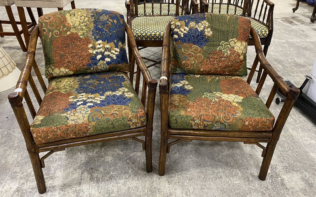Pair of Wood Bamboo Arm Chairs, Warren Wright's Jackson MS, good condition, has cushions. Pair of Wood Bamboo Arm Chairs, Warren Wright's Jackson MS, good condition, has cushions.