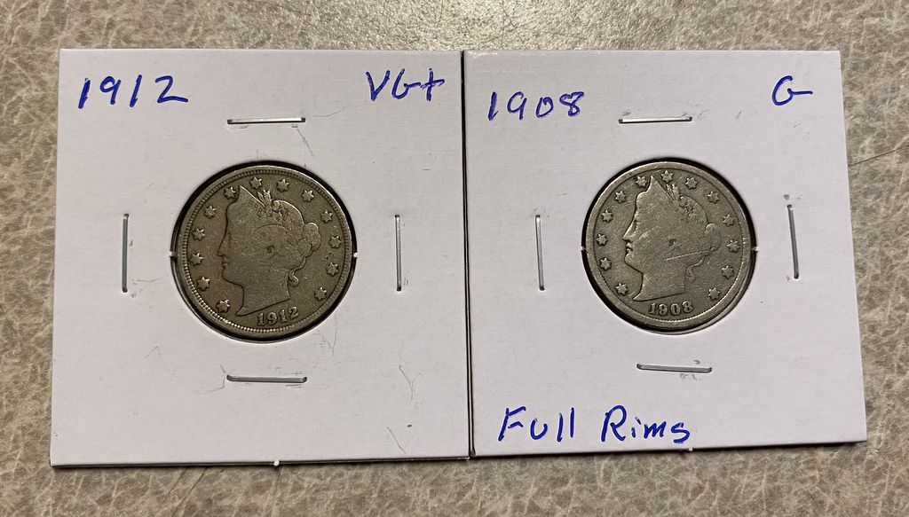 Two 1908 & 1912 Liberty "V" Nickels, paper cases. Two 1908 & 1912 Liberty "V" Nickels, paper cases.