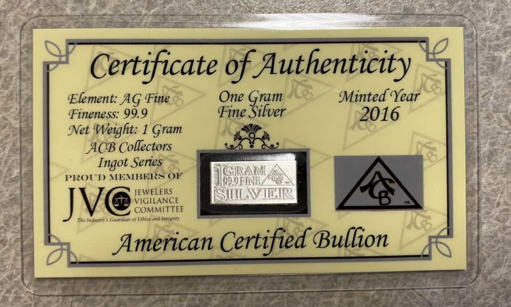 2016 One Gram Fine Silver American Certified Bullion, plastic case. 2016 One Gram Fine Silver American Certified Bullion, plastic case.