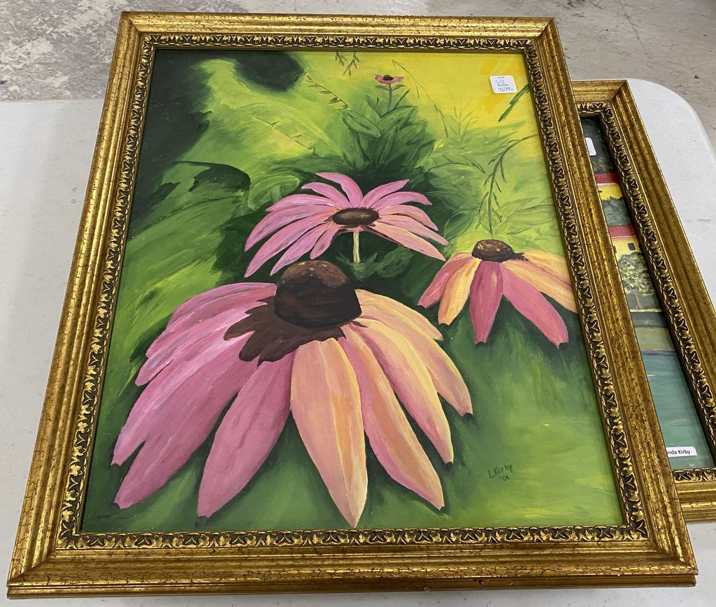 Linda Kirby Painting of Sunflowers, matted, signed lower right, 23"h., 19"w. Linda Kirby Painting of Sunflowers, matted, signed lower right, 23"h., 19"w.