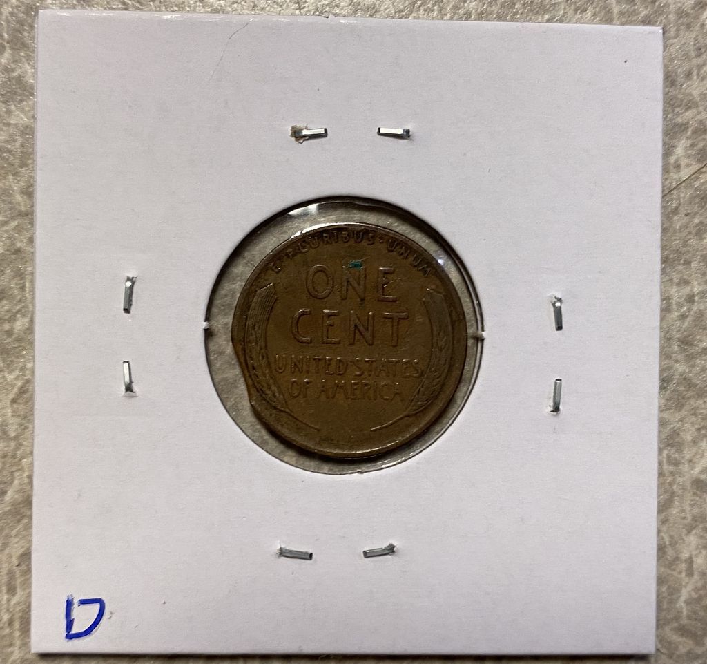 1941 Error Coin Penny, Clipped planchet on Lincoln wheat cent, paper case. 1941 Error Coin Penny, Clipped planchet on Lincoln wheat cent, paper case.