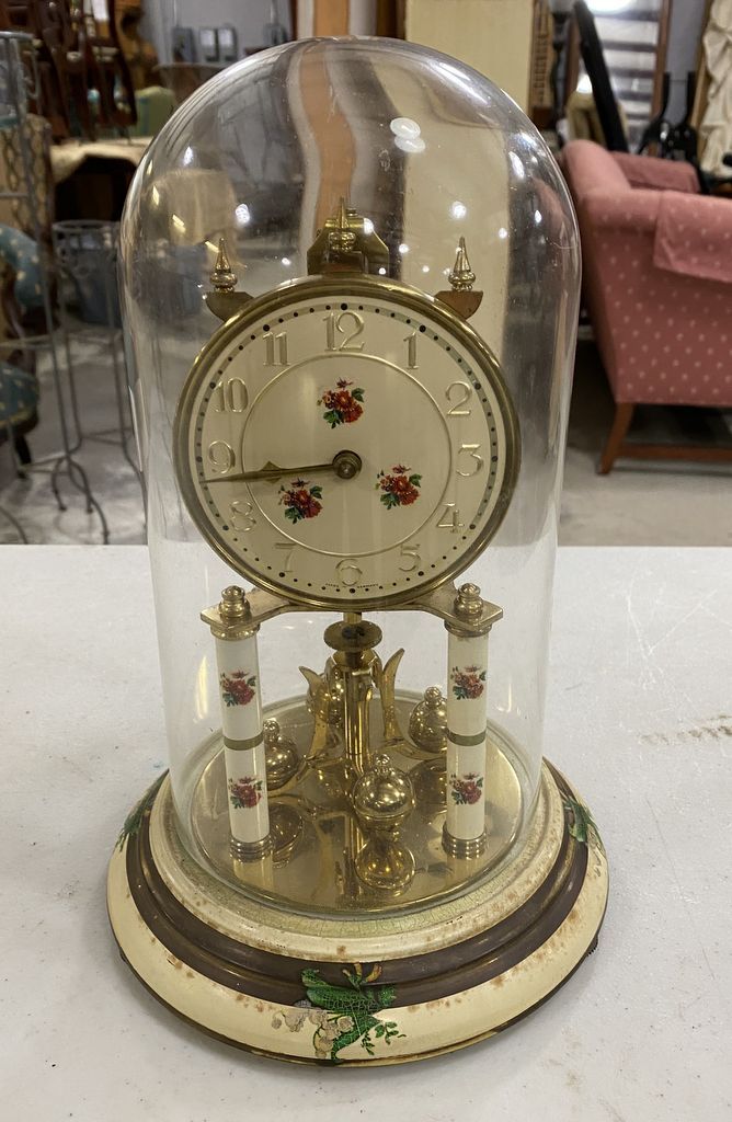 German Anniversary Clock, glass dome, has key, painted base, 12"h. German Anniversary Clock, glass dome, has key, painted base, 12"h.
