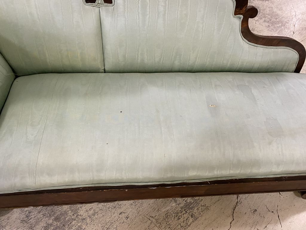 Antique Empire Style Fainting Sofa, veneered, some pieces chipped, fabric has dirty and stains, on casters, and tear, 77" Antique Empire Style Fainting Sofa, veneered, some pieces chipped, fabric has dirty and stains, on casters, and tear, 77"