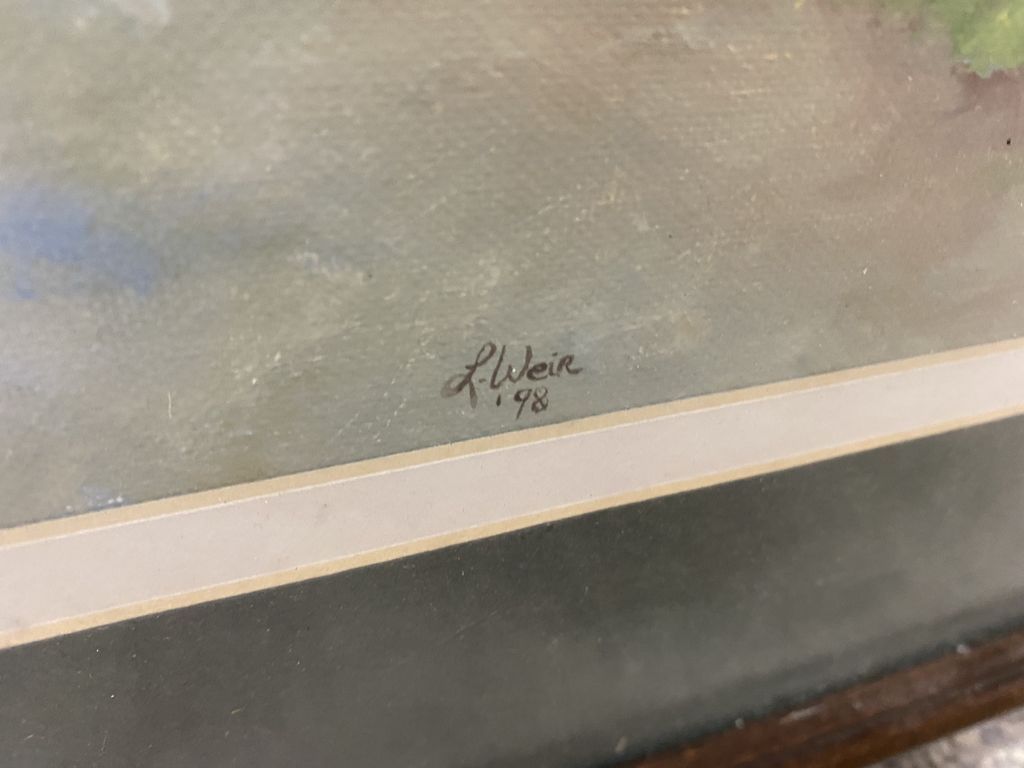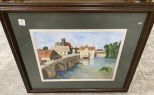 L. Weir European Bridge Painting, signed L. Weir 1998, matted, framed, 20"h., 25"w. L. Weir European Bridge Painting, signed L. Weir 1998, matted, framed, 20"h., 25"w.