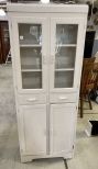White Painted Kitchen Cabinet, four door, glass top door, with two shelf, two drawers, one door needs adjusting, 68"h., 28"w., 11"w. White Painted Kitchen Cabinet, four door, glass top door, with two shelf, two drawers, one door needs adjusting, 68"h., 28"w., 11"w.