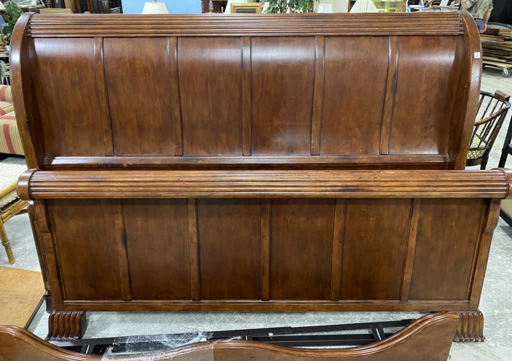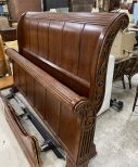 Modern Cherry King Size Sleigh Bed, light used wear, has wood rails. Modern Cherry King Size Sleigh Bed, light used wear, has wood rails.
