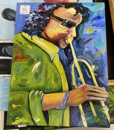 Linda Kirby "Jazz Trumpet" Painting, canvas, unframed, 12"h., 9"w. Linda Kirby "Jazz Trumpet" Painting, canvas, unframed, 12"h., 9"w.