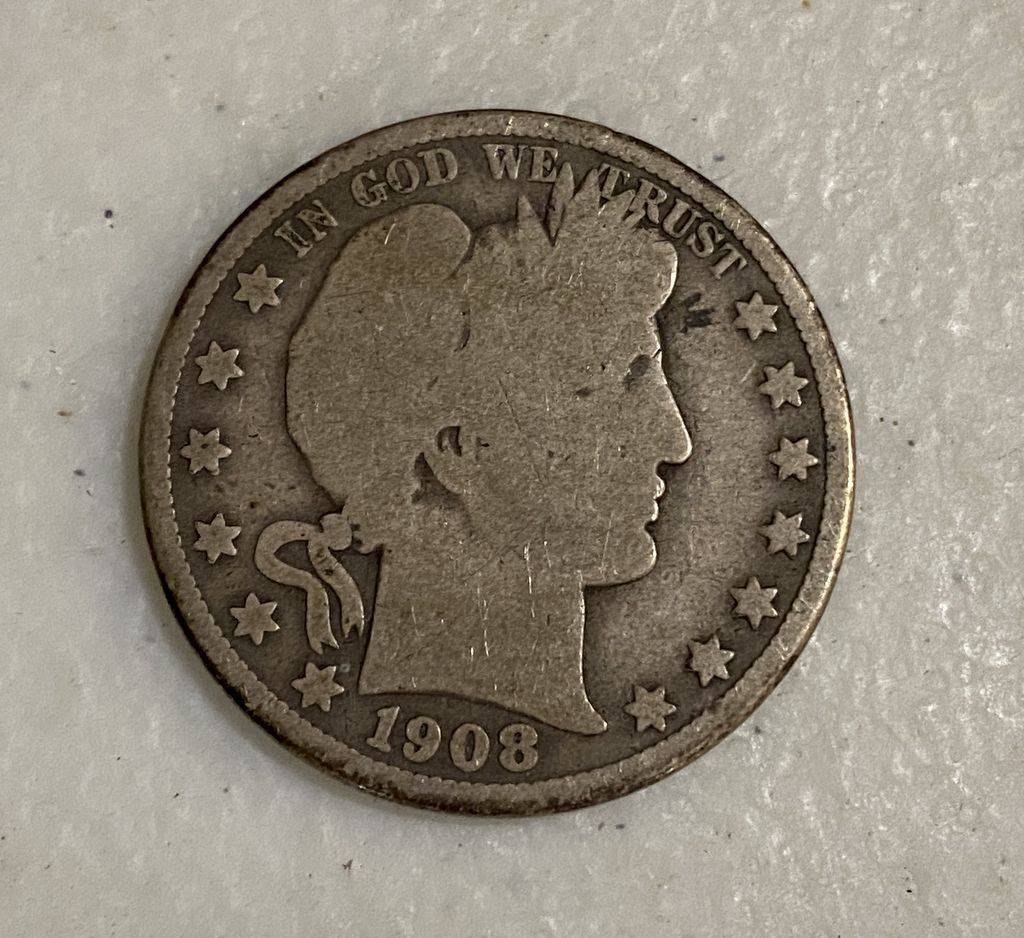 1908-O Barber Half Dollar, worn/average. 1908-O Barber Half Dollar, worn/average.