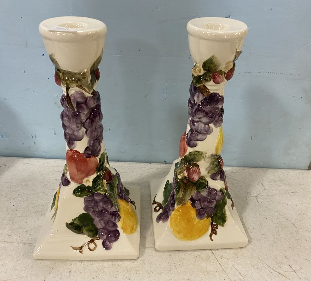 Pair of Porcelain Candle Sticks, grapevine design, 11"h. Pair of Porcelain Candle Sticks, grapevine design, 11"h.