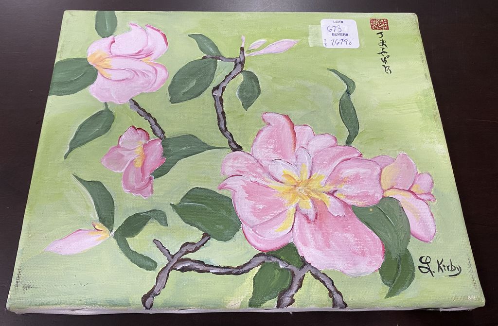 Linda Kirby Painting of Oriental Block Print, canvas, unframed, 8"h., 10"w. Linda Kirby Painting of Oriental Block Print, canvas, unframed, 8"h., 10"w.