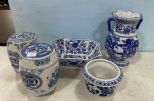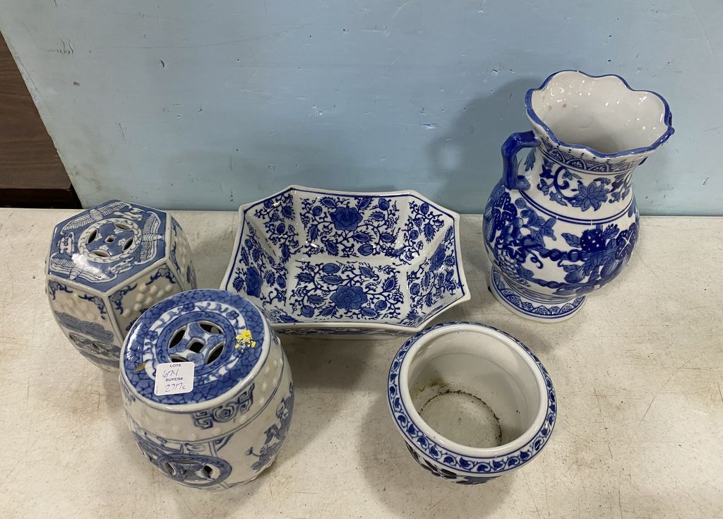 Five Blue and White Pottery Pieces, two mini garden seats, bowls, vases, and bowl. Five Blue and White Pottery Pieces, two mini garden seats, bowls, vases, and bowl.
