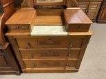 Victorian Style Vanity Dresser, with back mirror, needs some minor work, three drawers, crack on top glove box, white marble front insert, mahogany, 81"h., 39"w., 18"d. Victorian Style Vanity Dresser, with back mirror, needs some minor work, three drawers, crack on top glove box, white marble front insert, mahogany, 81"h., 39"w., 18"d.