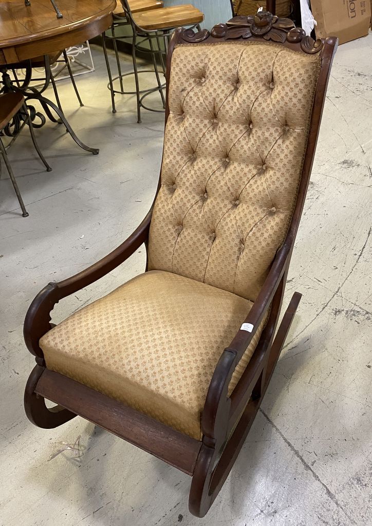 Victorian Style Rocker with tucked and pleated upholstery, has wear. Victorian Style Rocker with tucked and pleated upholstery, has wear.