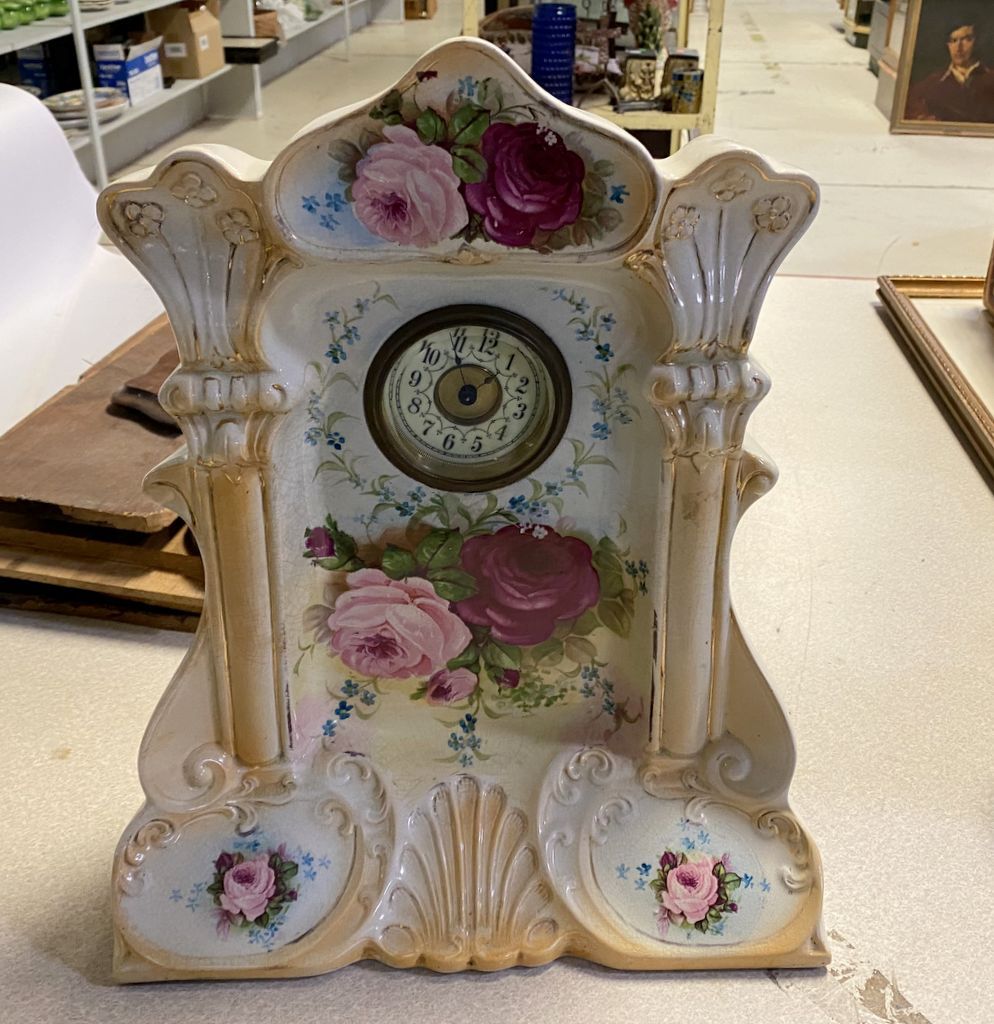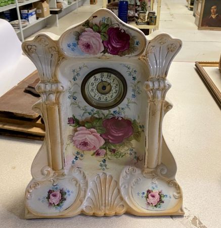 Vintage Victorian Style Porcelain Mantle Clock, roses, yellow/white, untested, 16"h. Vintage Victorian Style Porcelain Mantle Clock, roses, yellow/white, untested, 16"h.