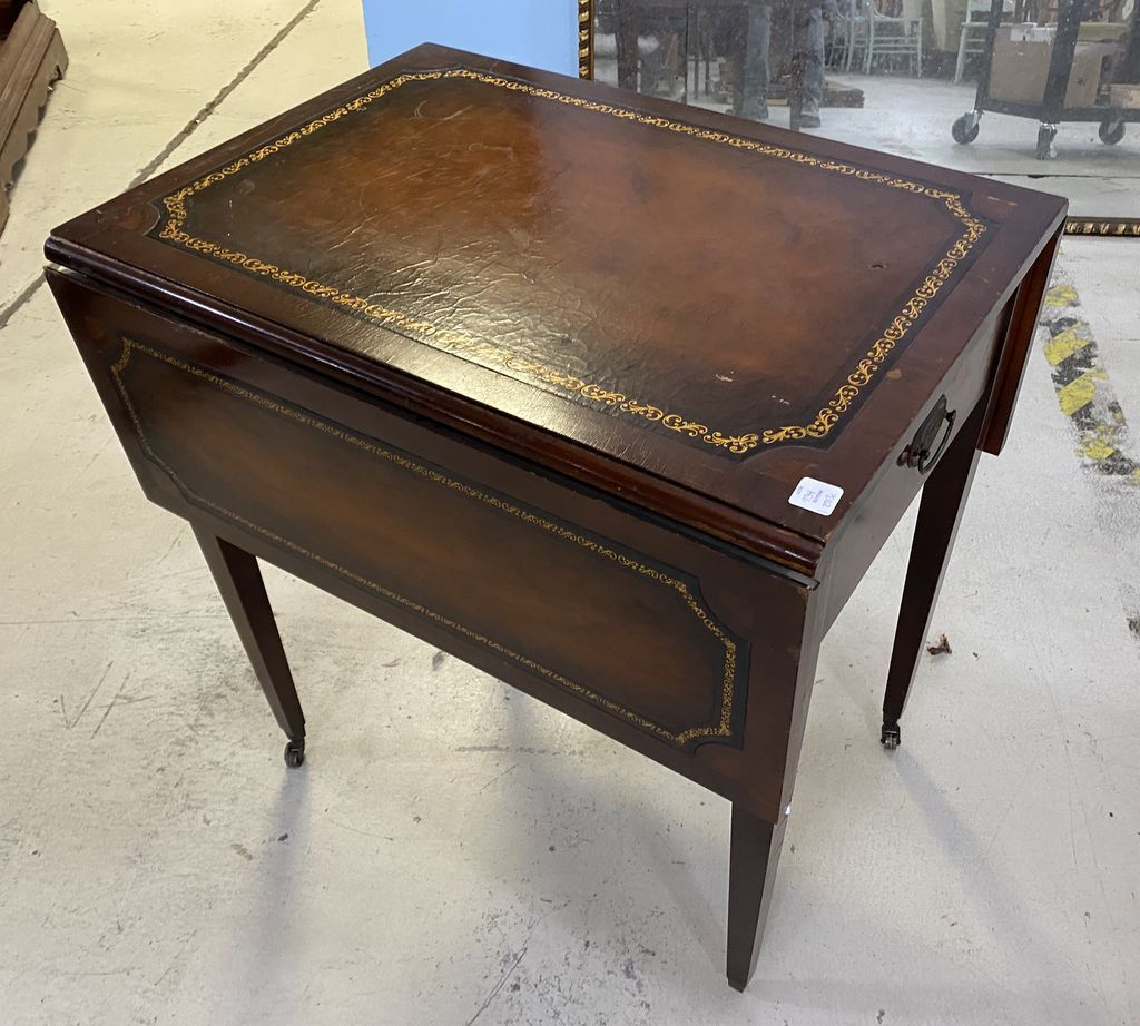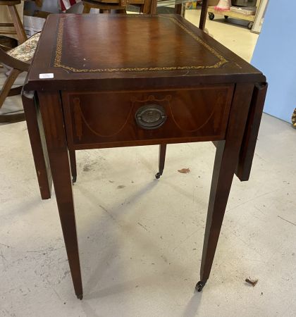 Federal Style Drop Leaf Side Table, leather tops, single drawer, missing caster, 28"h., 19"w., 26"d. Federal Style Drop Leaf Side Table, leather tops, single drawer, missing caster, 28"h., 19"w., 26"d.
