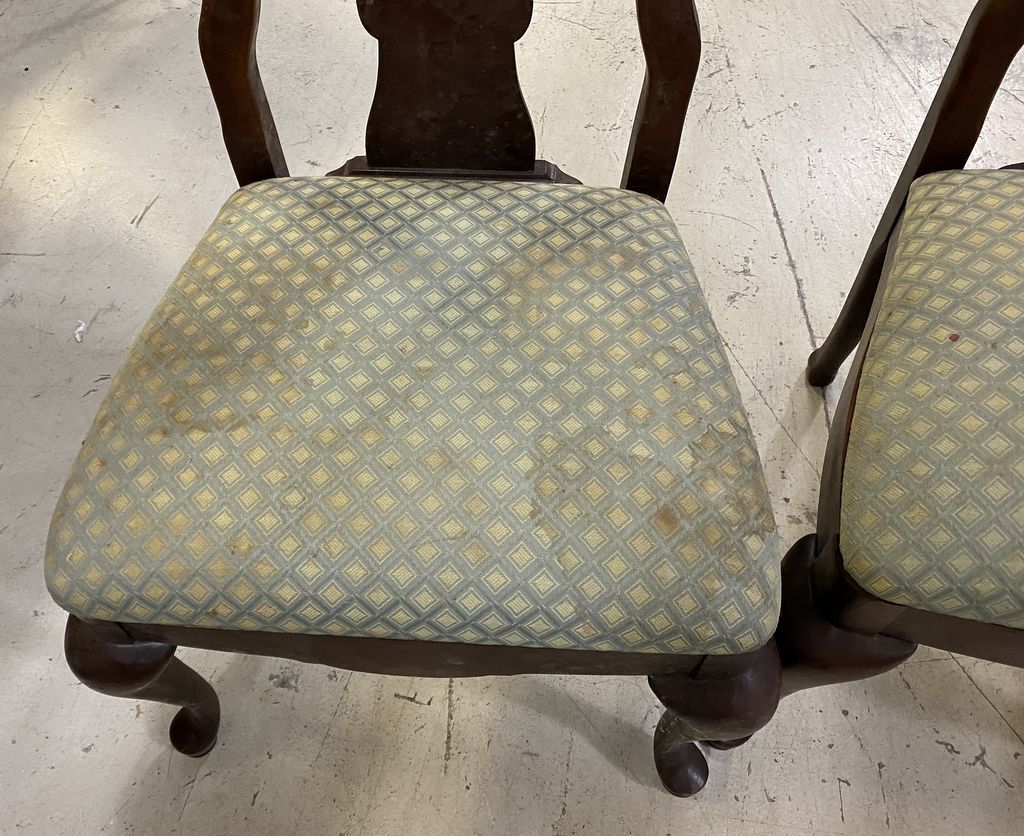 Pair of Mahogany Queen Anne Dining Chairs, dirty cushions, has wood finish wear. Pair of Mahogany Queen Anne Dining Chairs, dirty cushions, has wood finish wear.