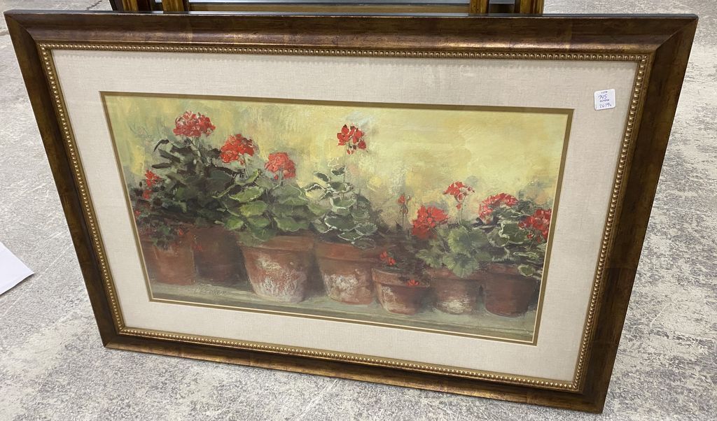 Large Print of Flower Planters by C Rowan, matted, framed, 26"h., 38"w Large Print of Flower Planters by C Rowan, matted, framed, 26"h., 38"w