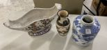 Porcelain floral planter urn, Oriental small vase, and blue and white ginger jar missing lid, 8"h. Porcelain floral planter urn, Oriental small vase, and blue and white ginger jar missing lid, 8"h.
