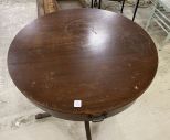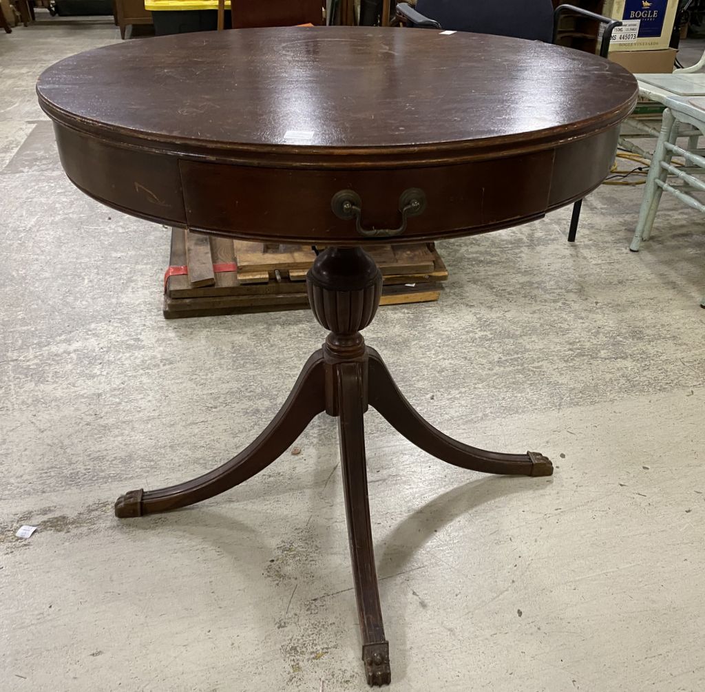Mahogany Duncan Phyfe Drum Table, pedestal base, single drawer, wear, and ring marks on top, 28"h., 29"dia. Mahogany Duncan Phyfe Drum Table, pedestal base, single drawer, wear, and ring marks on top, 28"h., 29"dia.
