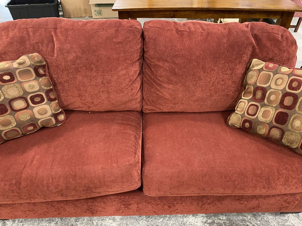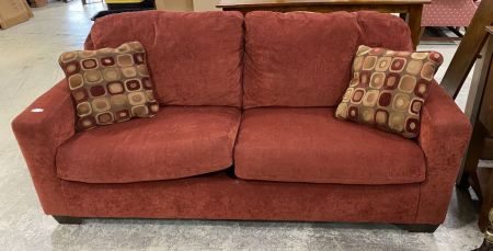 Modern Red Two Cushion Sofa, upholstered, good condition, two throw pillows, 78" long. Modern Red Two Cushion Sofa, upholstered, good condition, two throw pillows, 78" long.