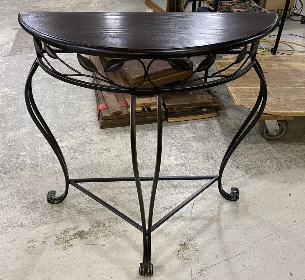 Modern Wall Demilune Table, metal base and wood top, 30"h., 31"w. Modern Wall Demilune Table, metal base and wood top, 30"h., 31"w.