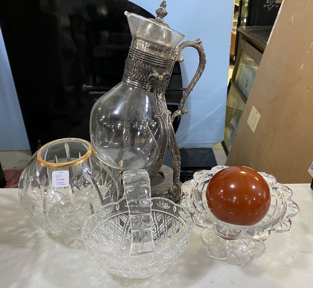 Glassware vases, basket, compote, and Silver Plate Coffee Pitcher Glassware vases, basket, compote, and Silver Plate Coffee Pitcher