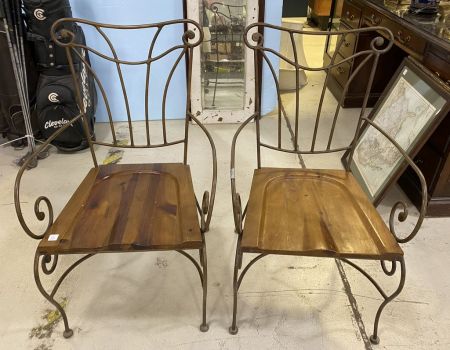 Pair of Wrought Iron Arm Chairs, wood seat, good condition. Pair of Wrought Iron Arm Chairs, wood seat, good condition.