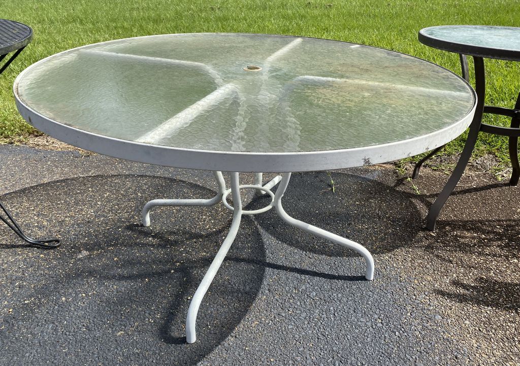 Large White Glass top Patio Table, pedestal base, used. Large White Glass top Patio Table, pedestal base, used.