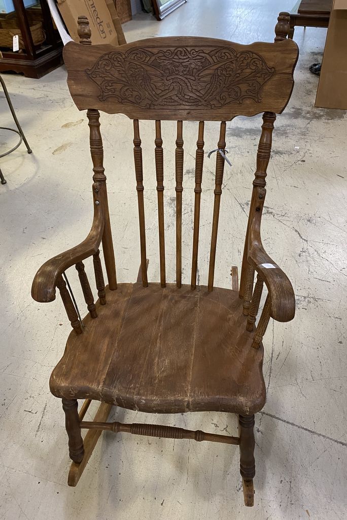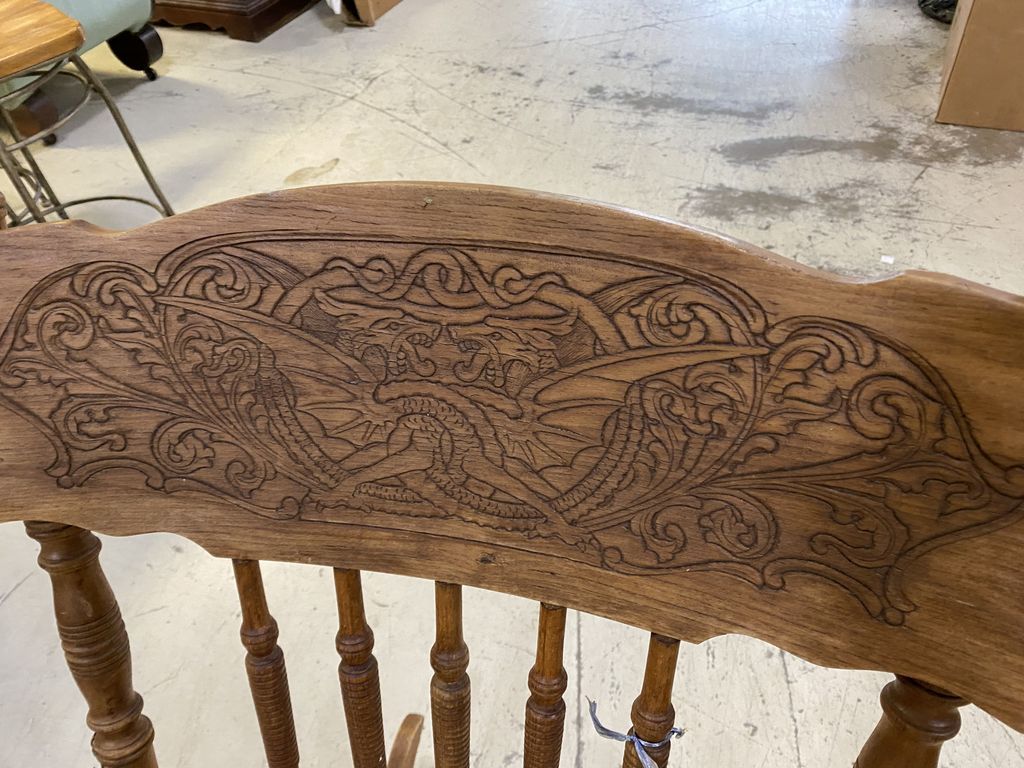 Vintage Oak Pressed Back Rocker, Dragon design back, spindle, arm rocker, has finish wear and aging. Vintage Oak Pressed Back Rocker, Dragon design back, spindle, arm rocker, has finish wear and aging.