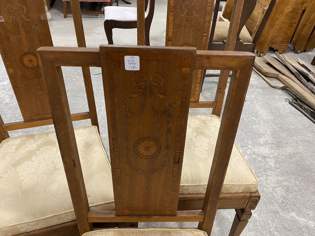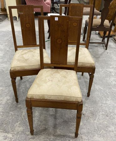 Three Antique French Style Side Chairs, inlaid back, floral cushion has stains. Three Antique French Style Side Chairs, inlaid back, floral cushion has stains.