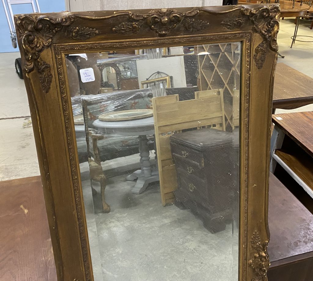 Vintage Wood Gold Gilt mirror, beveled, has age wear, 54"h., 21"w. Vintage Wood Gold Gilt mirror, beveled, has age wear, 54"h., 21"w.
