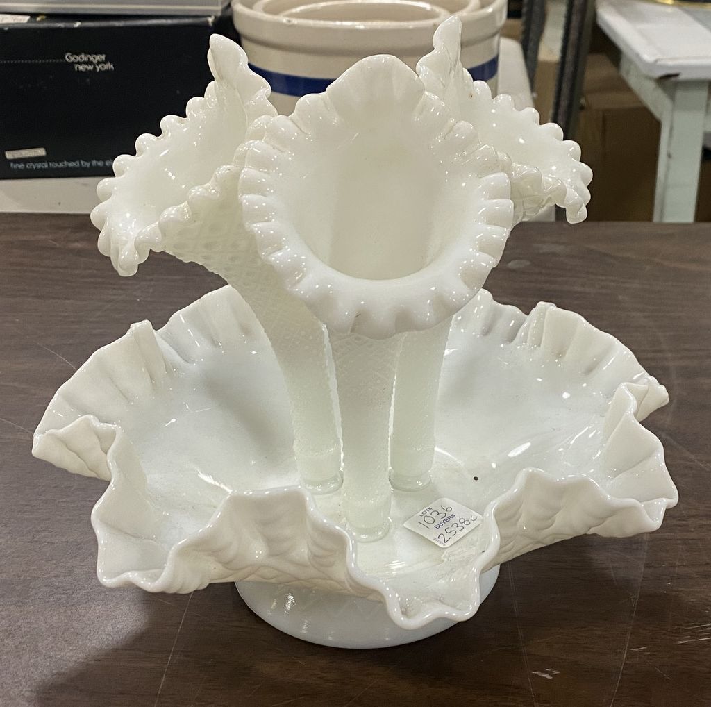 Milk Glass Epergne, three slots, crimped rim Fenton style, good condition. Milk Glass Epergne, three slots, crimped rim Fenton style, good condition.