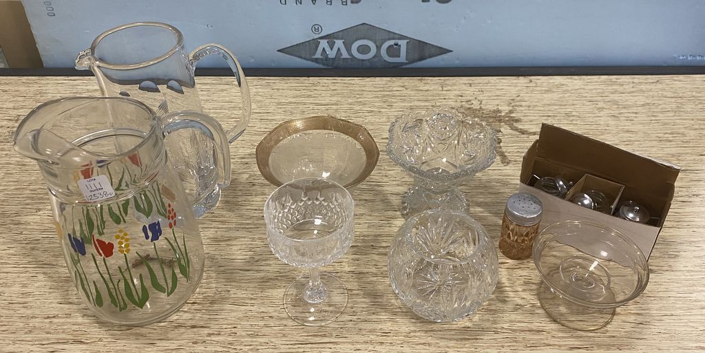 1111 Group of Glassware Including 2 Water Pitchers, Set of Salt and Pepper Shakers, and Other Misc Items
