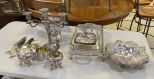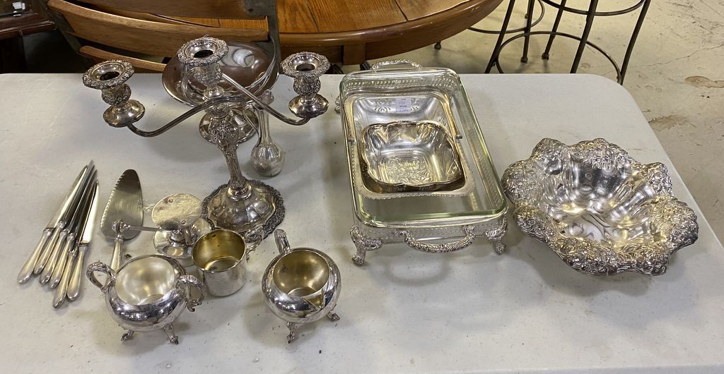 Group of Serving Silver Plate Pieces, candle stand, casserole stand, bowl, compote. Group of Serving Silver Plate Pieces, candle stand, casserole stand, bowl, compote.