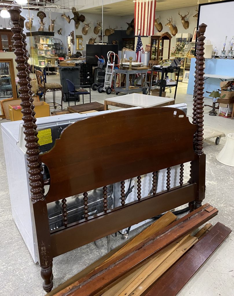 Full Size Jenny Lind Style Four Poster Bed, mahogany, with wood rails. Full Size Jenny Lind Style Four Poster Bed, mahogany, with wood rails.