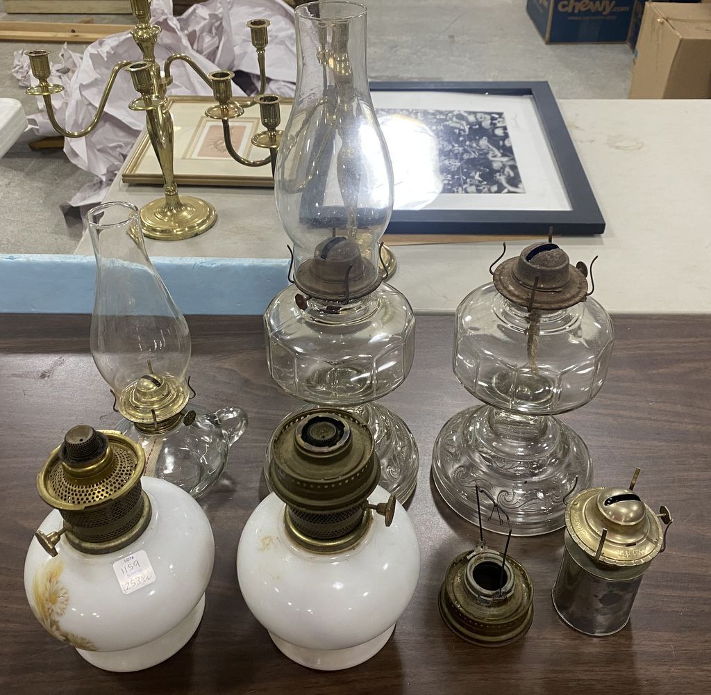 Group of Oil Lamps. Includes pair with one missing a shade. Pair of Aladdin Lamps, and 2 misc oil lamps. 18.5" h. Group of Oil Lamps. Includes pair with one missing a shade. Pair of Aladdin Lamps, and 2 misc oil lamps. 18.5" h.