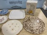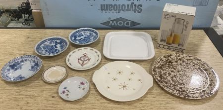 1160 Group of Porcelain Platters, Plates, Bowls, and Luminarc Octime 4 Glass and Pitcher Orange Juice Set in Box