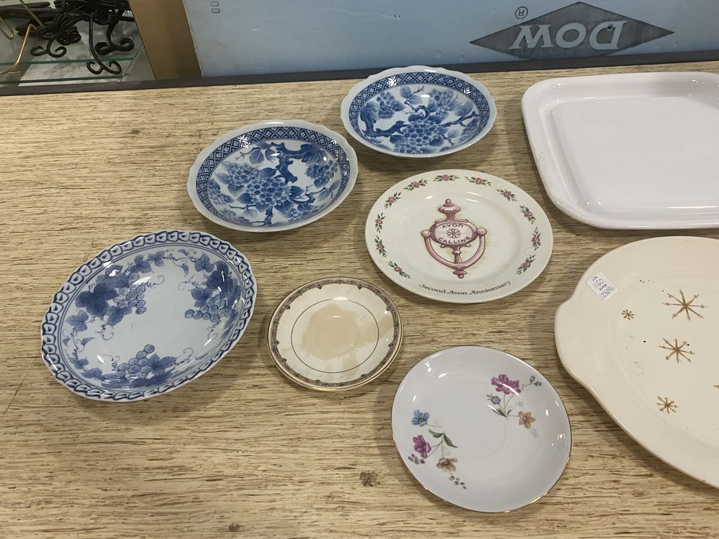 Group of Porcelain Platters, Plates, Bowls, and Luminarc Octime 4 Glass and Pitcher Orange Juice Set in Box. Royal Ironstone, Corner Ware, Avon Calling Commemorative Plate. Group of Porcelain Platters, Plates, Bowls, and Luminarc Octime 4 Glass and Pitcher Orange Juice Set in Box. Royal Ironstone, Corner Ware, Avon Calling Commemorative Plate.