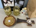 1269 Our House Picture Frame, Wood Cross, Ceramic Figurine, Vintage Glass Candle Holders, Pottery Plates, Plate Hangers