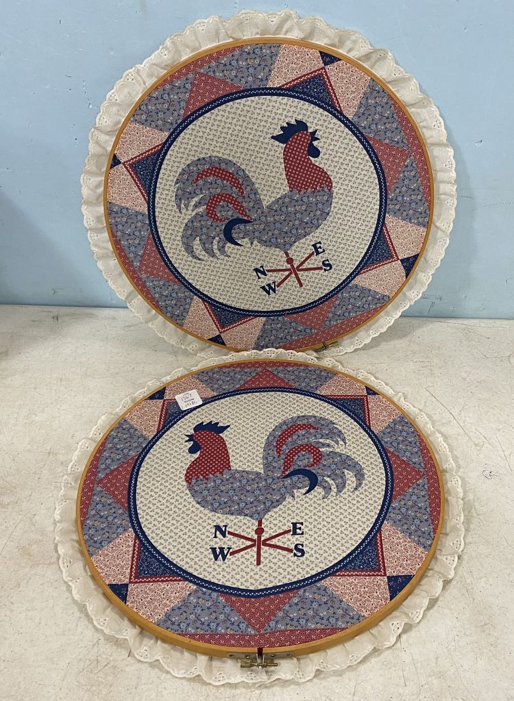 Pair of Rooster Prints with Eyelet Trim, framed with wood stretchers, 16"dia. Pair of Rooster Prints with Eyelet Trim, framed with wood stretchers, 16"dia.