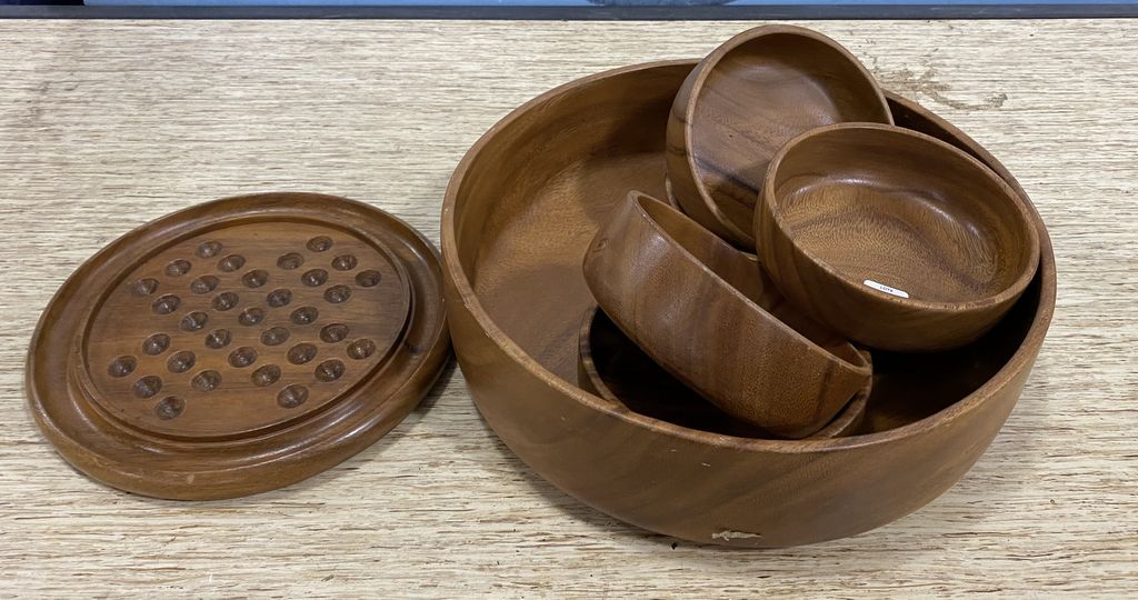 Wood Serving Salad bowl, and five salad bowls. Wood Serving Salad bowl, and five salad bowls.