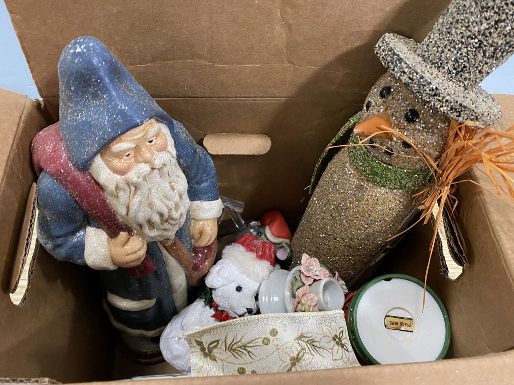 Box Lot of Christmas Decorations, ornaments, santa, snowman, figurines. Box Lot of Christmas Decorations, ornaments, santa, snowman, figurines.