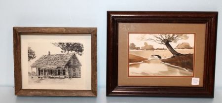 375 Countryside Watercolor Signed Lower Left & Picture of Cabin