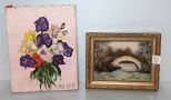 381 Small Painting of Bridge & Pansy Painting Signed Alice