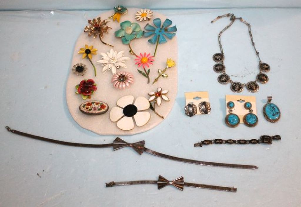 Consisting of two necklaces, two bracelets, two pair earrings, pendant and group of vintage stick pins Consisting of two necklaces, two bracelets, two pair earrings, pendant and group of vintage stick pins