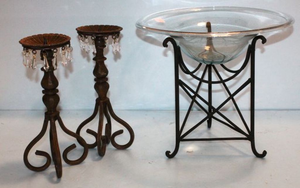364 Glass Centerpiece on Iron & Pair of Iron Candlesticks