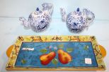 418 Two Blue and White Chinese Teapots & Pear Platter