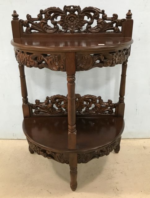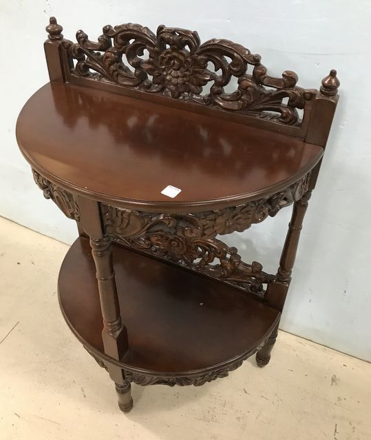 Indo Antique Reproduction Wall Console Table, cherry finish, carved designs, demilune, two tier, 38"h., 25"w., 13"d. Indo Antique Reproduction Wall Console Table, cherry finish, carved designs, demilune, two tier, 38"h., 25"w., 13"d.